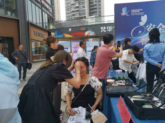 活动现场,工作人员通过引导公众在线扫码填写“化妆品安全‘你点我检’调查问卷”,主动收集群众关注问题及意见建议;通过摆放宣传展架、发放宣传资料等形式向公众宣贯《企业落实化妆品质量安全主体责任监督管理规定》《化妆品网络经营管理办法》等法规,进行儿童化妆品“小金盾”标识、“牙膏的安全使用”、化妆品不良反应处置等化妆品安全知识科普;通过组织医疗机构皮肤美容科室开展现场义诊咨询活动,组织协会会员单位开展免费理发、修眉及肤质检测、护理等公益服务活动,引导现场群众主动关注、关心化妆品安全,主动参与到化妆品监管工作,营造良好的宣传氛围。本次活动,现场发放宣传资料1000余份,引导填报调查问卷30余份,接待现场咨询200余人次,提供咨询义诊及公益服务100余人次,引起了广泛关注,取得良好宣传效果。