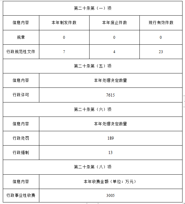 (三)政府信息管理情况。严格执行省局AG真人管理办法等规定,进一步健全内容审核和信息发布审核机制,压紧压实各方审查责任,对拟公开的内容严格进行规范性审核和保密审查。持续动态更新、规范发布规范性文件及有关工作文件,进一步做好涉药品监管建议提案答复、规划、许可、部门预决算、行政执法等法定政府信息的主动公开工作。2023年,制发行政性规范文件7件,废止4件,现行有效23件。