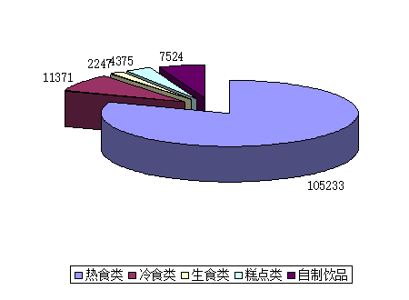 按食品种类划分,热食类食品制品105233家,冷食类食品制品11371家,生食类食品制品2247家,糕点类食品制品4375家,自制饮品销售7524家。